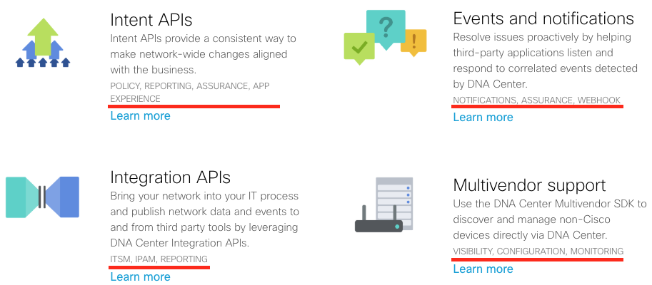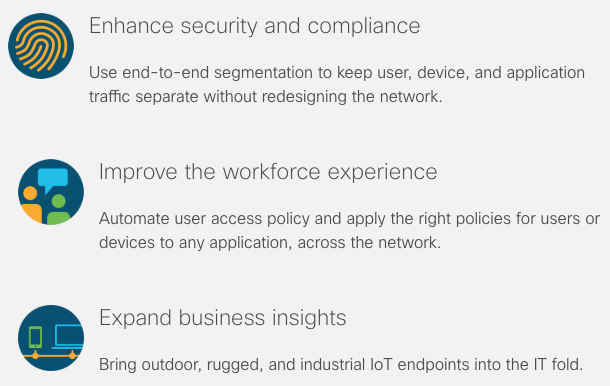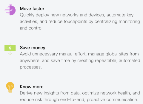 - simplified operations - 네트워크 제어 집중화, 관리 자동화, 워크플로우 통합, SD-Access, SD-WAN