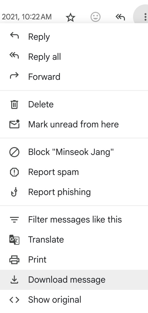 이메일 클라이언트는 EML 형식으로 개별 메일을 내보내는 기능이 있습니다. 이 기능을 통해 개별 메일을 다운로드 받습니다. 본 예제에서는 2021년 11월에 3건, 2021년 12월에 1건, 총 4개의 메일을 다운로드 하였습니다.