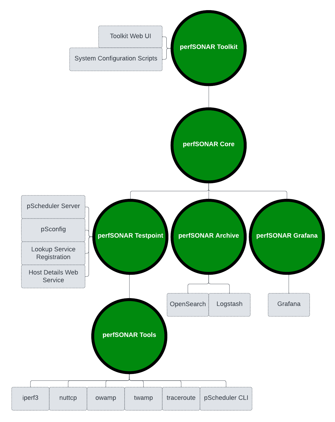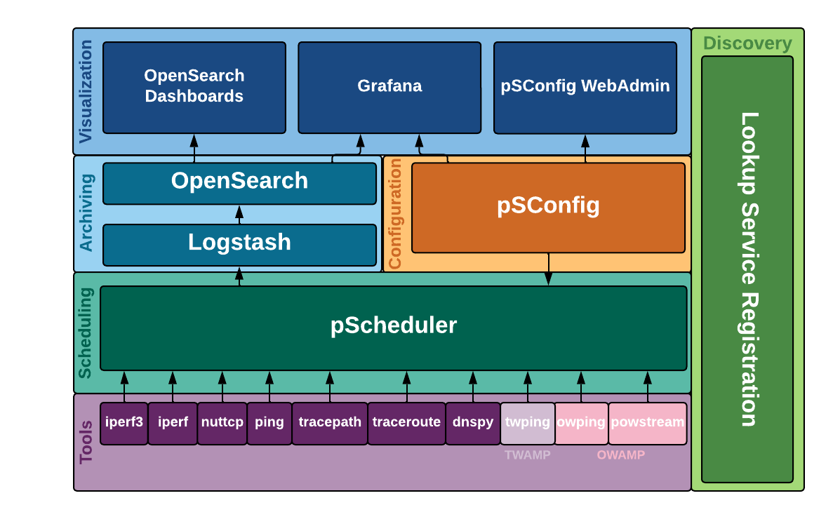 - perfsonar-tools, pscheduler-bundle-full (pScheduler Server), perfsonar-psconfig-pscheduler (pSconfig), perfsonar-lsregistrationdaemon (Lookup Service), …