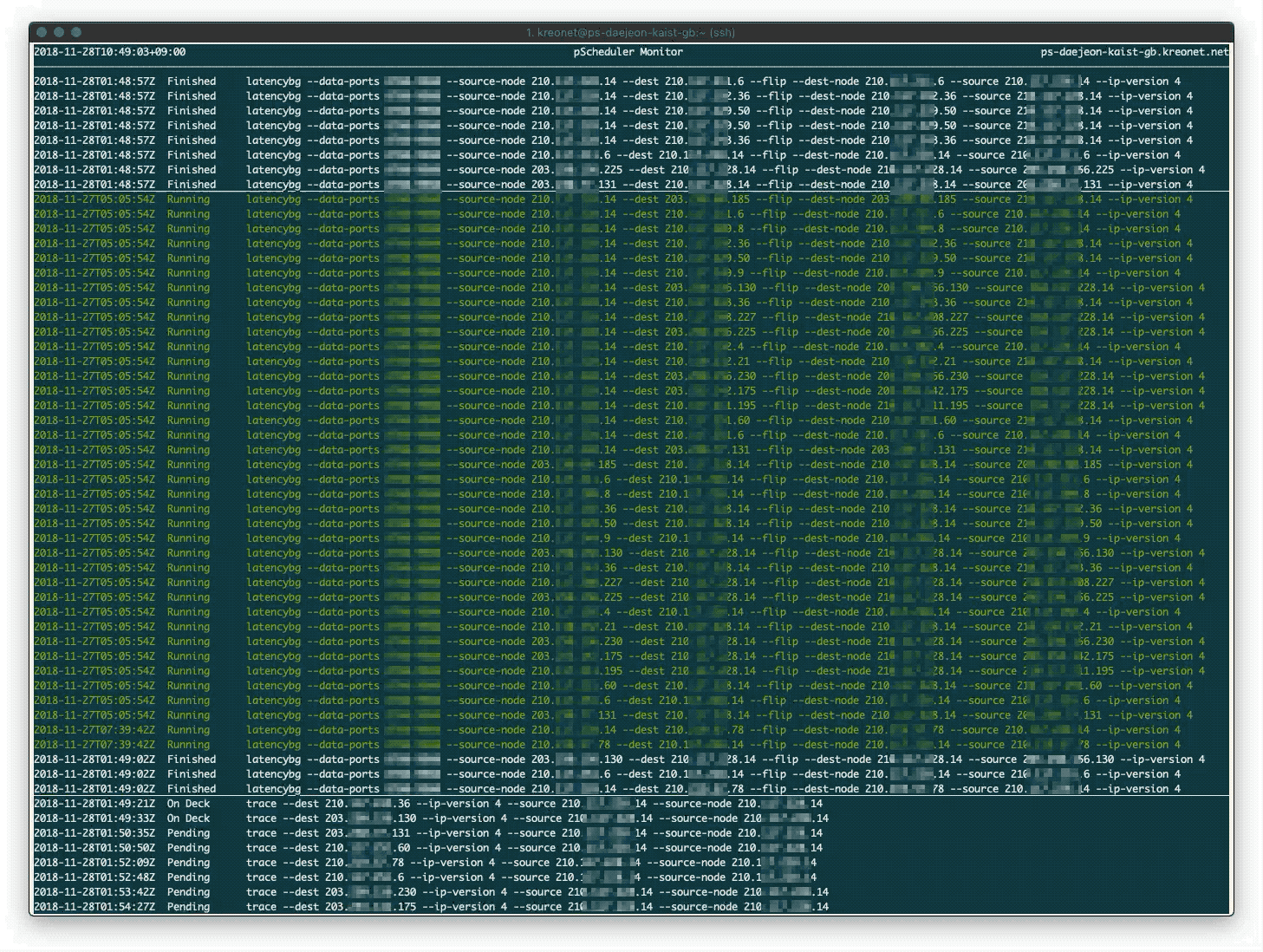 현재 접속한 서버의 pscheduler를 통한 테스트 스케줄 수행 및 대기 현황을 확인합니다.