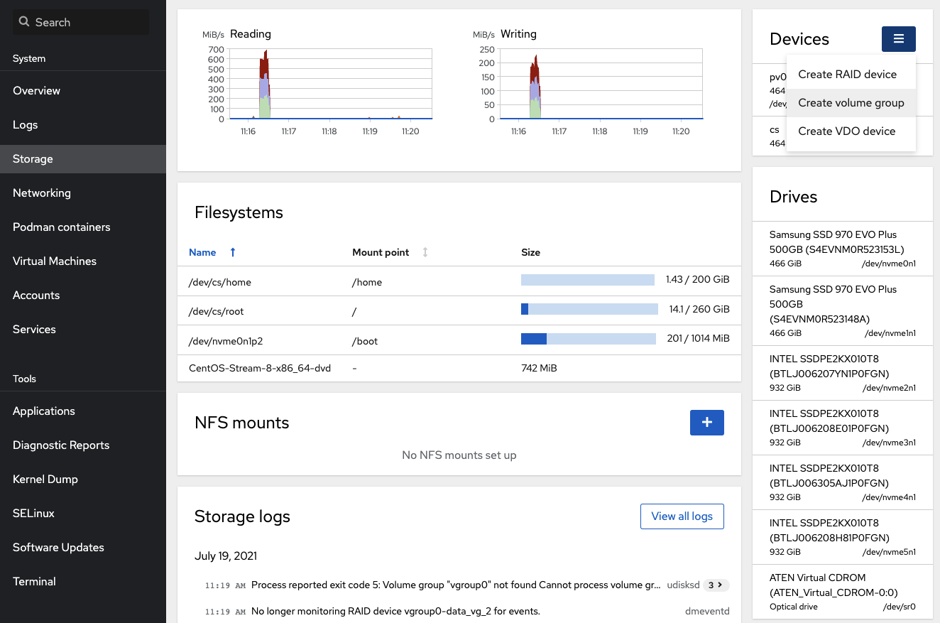 # lsblk NAME MAJ:MIN RM SIZE RO TYPE MOUNTPOINT nvme2n1 259:3 0 931.5G 0 disk └─nvme2n1p1 259:5 0 931.5G 0 part nvme3n1 259:2 0 931.5G 0 disk └─nvme3n1p1 259:6 0 931.5G 0 part nvme4n1 259:0 0 931.5G 0 disk └─nvme4n1p1 259:7 0 931.5G 0 part
