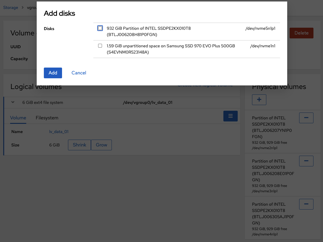 # vgdisplay --- Volume group --- VG Name vgroup0 Format lvm2 VG Access read/write VG Status resizable ... Free PE / Size 952709 / 3.63 TiB